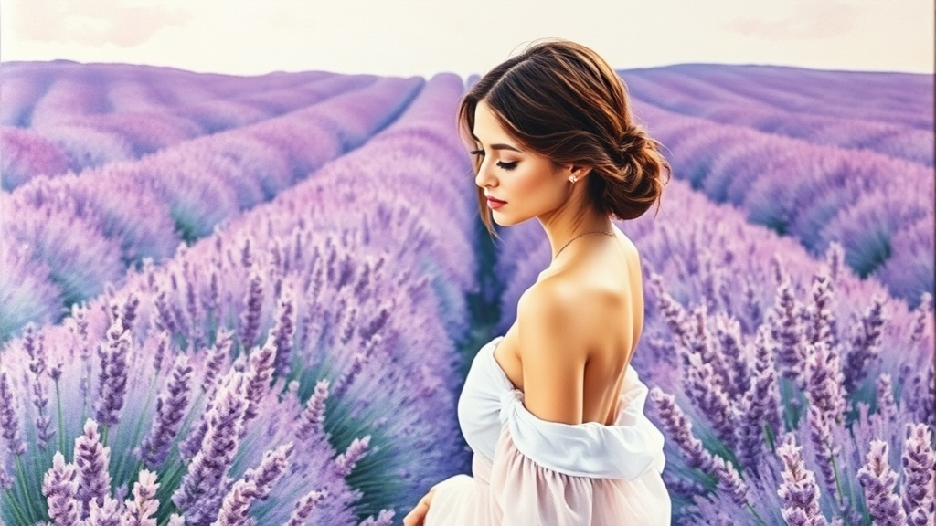 A captivating watercolor portrait on canvas depicting a graceful woman, reminiscent of Claude Monet's style, set amidst expansive lavender fields. The painting embraces impressionistic landscapes and portraits, blending pastel hues with vibrant dashes of color. The scene is brought to life through pronounced and blurred brushstrokes, capturing the essence of beauty and tranquility. The overall composition exhibits a harmonious balance of elegance and serenity, encapsulated within a square frame.