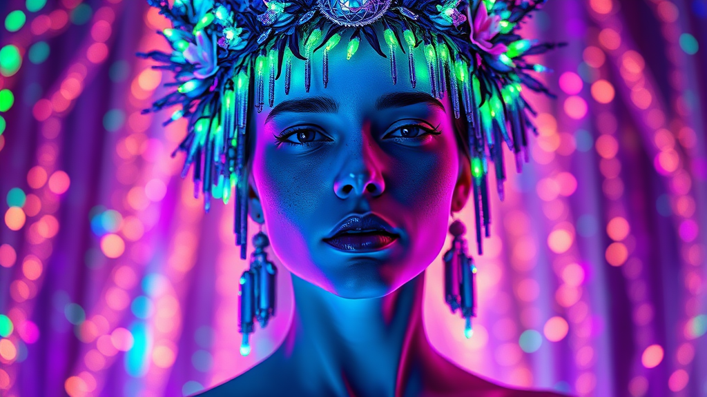 A captivating wide-angle fashion photograph captures the upper body of a woman, her expression serene and distant in a lucid, dream-like atmosphere. Her skin possesses an intense glow, resembling bioluminescent cybercore, illuminating with vibrant neon hues of blue, green, and purple. She is adorned with an insanely detailed, intricate headdress made of marginalia, dripping with bright neon lights. The colors are exquisite, creating a mesmerizing spectacle. The background is a vivid neon wonderland, resembling a glowing forest filled with dream-like particles in shades of blue, green, and purple. The composition adheres to the rule of thirds and golden ratio, showcasing photorealism with raytraced shadows and a focused depth of field. The asymmetric composition and hypermaximalist design emphasize insane details, rendered with octane for cinematic realism, creating an unreal yet vividly realistic image in 8k resolution.