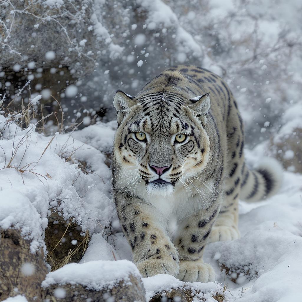 A captivating wildlife photograph showcasing a snow leopard in a striking medium shot, prowling through a snowy, rugged mountain forest. The setting is an overcast day, the dense layer of snow covering the rocky terrain adding to the scene's mystique. The snow leopard's full body is visible, capturing its elegant and powerful form. With an intense gaze directed towards the viewer, its predatory nature is palpable. The eyes are mesmerizingly detailed and piercing, drawing you in with their sharp focus. The image is rendered in high resolution and crisp detail, with natural lighting accentuating every texture of its fur and the surrounding environment.