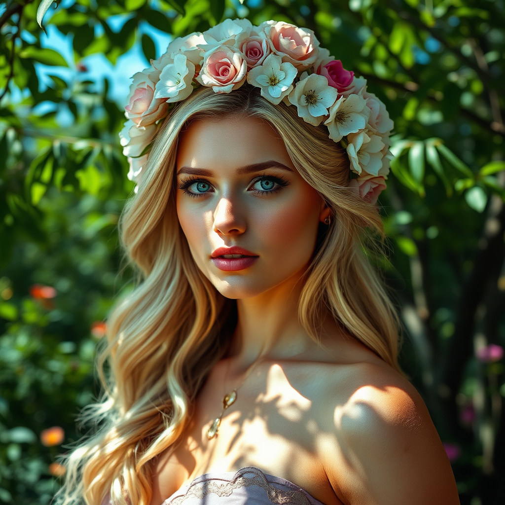A captivating woman, adorned with an intricate floral headdress, her blonde locks cascading elegantly around her shoulders. Her blue eyes glisten with allure, reflecting the clear blue sky of the garden that surrounds her. The seductive attire she wears, made of delicate fabrics that complement her figure, enhances her enchanting presence. Sunlight filters through the tree leaves, casting dappled shadows that play across the realistic textures of her skin, creating an ethereal, almost magical ambiance in the verdant paradise.