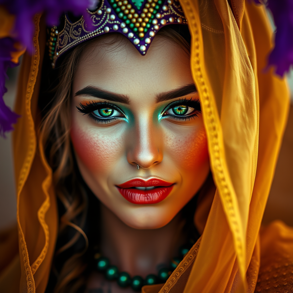 A captivating woman celebrating Mardi Gras, enveloped in vivid and expressive colors, radiating charm and allure. Her gaze directly connects with the viewer in a portrait style, with photography capturing her detailed and realistic skin in an ultra-high resolution, 8k quality. The full-length frame allows appreciation of the intricate, raw color art. Her style includes a piercing, with diffused soft lighting enhancing her presence. A shallow depth of field ensures sharp focus, creating a hyperrealistic effect, while cinematic lighting adds depth and drama. She exudes an aura of playful flirtation amidst the festive atmosphere, embodying the vibrant spirit of the celebration.