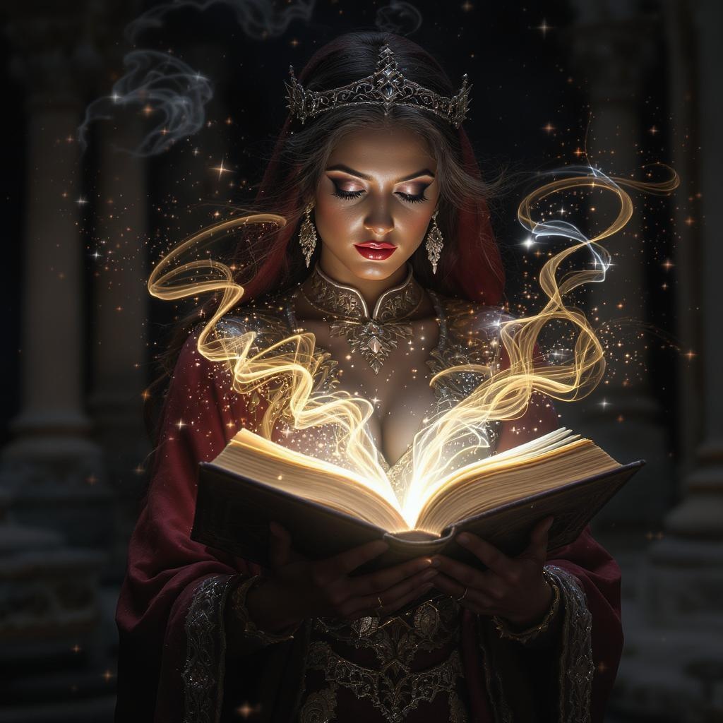 A captivating woman cradles an enchanted tome, its pages emitting ethereal glows and intertwining luminous trails that dance in the air, surrounded by particles of shimmering light dust. Clad in ornate and otherworldly robes, she stands as a beacon of magic and mystery. The scene is captured in exquisite detail, with cinematic lighting accentuating every facet of the surreal setting. The artistic composition renders a lifelike yet fantastical visage, achieving a sharp and mesmerizing focus in vivid 4k quality.