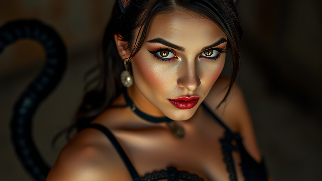 A captivating woman dressed as Catwoman in lingerie, featuring a playful cat tail, gazes confidently at the viewer from a full-length frame. The portrait captures her with ultra-realistic skin details and piercing eyes, all brought to life by soft, diffused lighting that enhances the cinematic atmosphere. The photo-realistic 8k image boasts a high detail RAW color composition, presenting her in sharp focus with a shallow depth of field for hyperrealism. The scene is crafted with meticulous attention to detail, ensuring a visually stunning depiction. The image is free from imperfections such as low resolution, text errors, cropping issues, or any signs of poor quality. The model is depicted gracefully, avoiding anomalies like extra limbs or poorly drawn features, resulting in a perfectly proportioned and captivating portrayal.