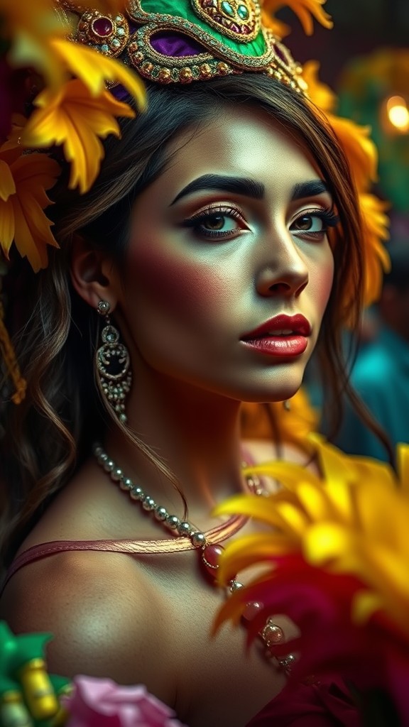 A captivating woman enjoying Mardi Gras, surrounded by vibrant and expressive colors, exuding charm and allure, engaging the viewer with her gaze. The portrait photography captures her in striking detail, highlighting her realistic, detailed skin. She stands in a full-length frame, with high-detail RAW color art enhancing the scene. Her piercing adds an intriguing element, while diffused soft lighting and shallow depth of field create an intimate atmosphere. The sharp focus of the hyperrealistic image is enhanced by cinematic lighting, ensuring a compelling visual experience.