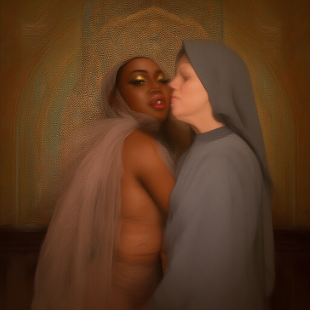 A captivating woman exuding devilish charm, resembling a flirty Instagram model, stands in a church hall, sharing a kiss with a serene nun. Behind her, a stunning mosaic fresco serves as the backdrop, highlighting her elegantly contoured body and shimmering gold eyelashes. Draped in a delicate fabric veil, her presence is both striking and enigmatic. The scene embraces the rule of thirds, emphasizing graceful curves, dynamic lines, and intriguing shapes. Emotion and intensity take precedence over composition, capturing the essence of a moment crafted by a renowned fashion photographer.