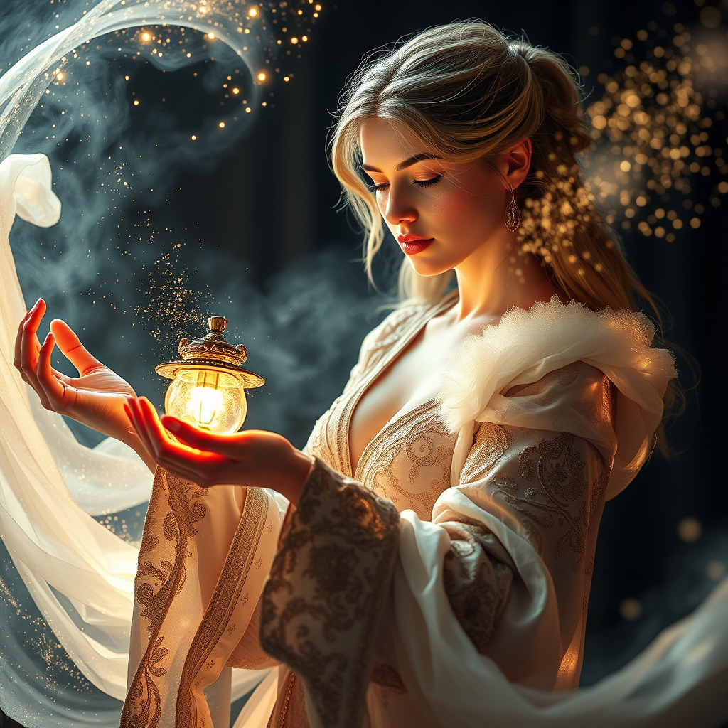 A captivating woman gracefully holding an enchanted tome with shimmering light trails cascading around her; ethereal dust twinkles in the air as she dons intricately designed robes of fantasy. The scene is rendered in exquisite detail, with cinematic lighting casting a magical glow that highlights the surreal beauty of the moment. The image is rendered in ultra-high definition, capturing every nuance and texture in sharp focus, creating a mesmerizing fantastical visual experience.