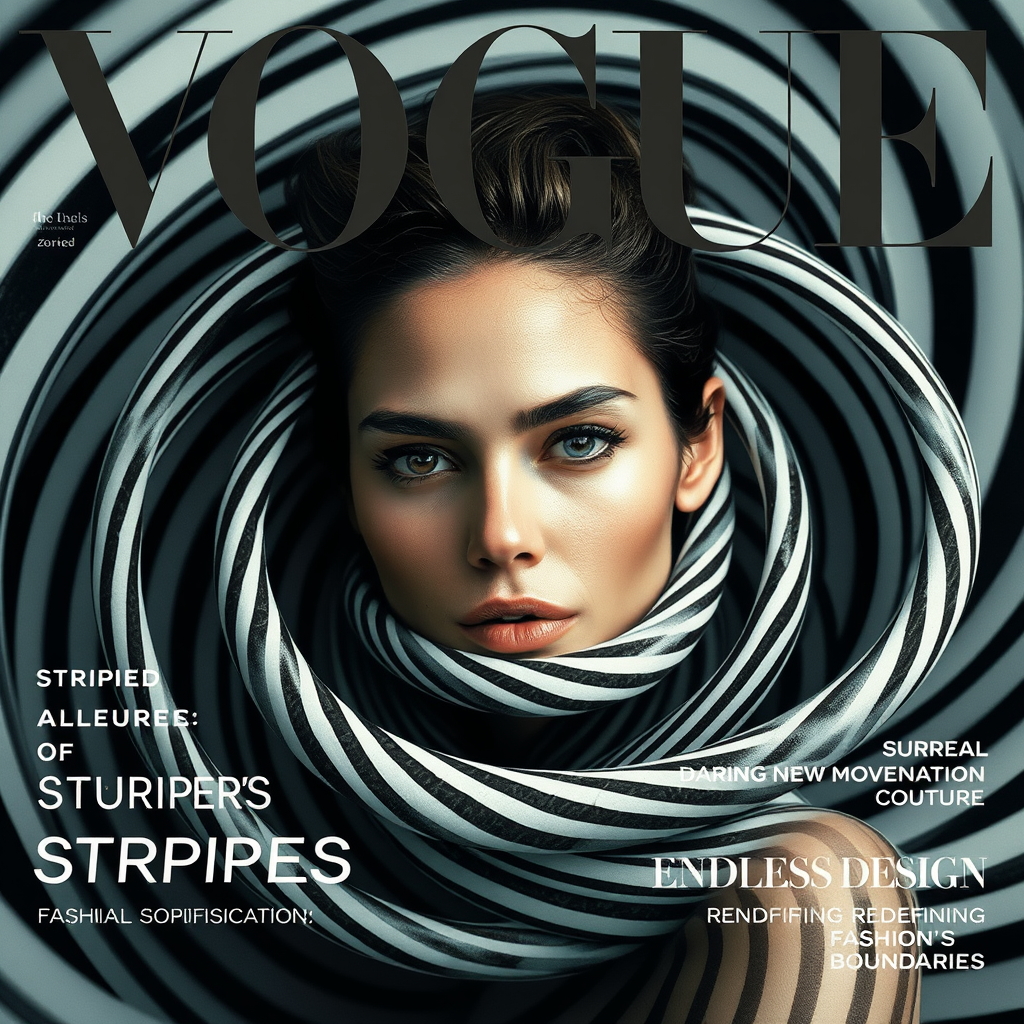 A captivating woman graces the cover of VOGUE magazine, enveloped in a mesmerizing vortex of swirling stripes. These dynamic lines twist and spiral elegantly around her, seamlessly blending her form into a surreal, hypnotic pattern. Her expression remains serene, with her face partially obscured by the enchanting waves of stripes, giving the cover an ethereal, otherworldly allure. At the top, the VOGUE logo stands bold and metallic, striking against the abstract backdrop. Cover highlights include: "Striped Allure: Fashion’s Daring New Movement," "Surreal Sophistication: Where Art Meets Couture," and "Endless Design: Redefining Fashion’s Boundaries."