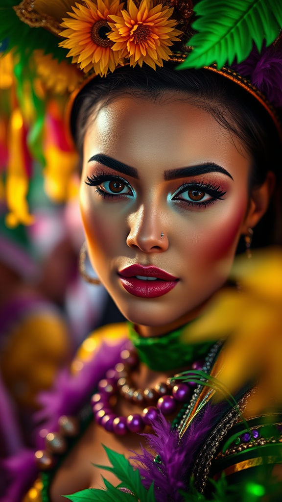 A captivating woman immersed in the vibrant festivities of Mardi Gras, surrounded by an explosion of bright, expressive colors. She is strikingly gorgeous and exudes an alluring charm as she locks eyes with the viewer. This portrait captures her in dynamic, photo-realistic detail, emphasizing her flawless skin and the intricate elements of her attire. She stands full frame, set in an 8k resolution that highlights the richness of the High detail RAW color art. Her features, including a stylish piercing, are gently illuminated by diffused soft lighting, with a shallow depth of field bringing her into sharp focus. The scene is bathed in hyperrealism, complemented by cinematic lighting, creating an engaging and authentic Mardi Gras experience.