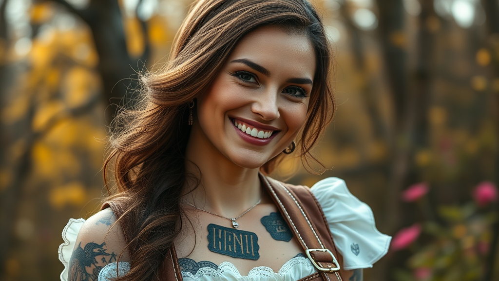 A captivating woman in a Bavarian outfit, smiling with a playful demeanor, showcasing tattoos, engaging with the viewer, captured in a portrait-style photograph. The image features a hyper-detailed, lush background, carefully rendered skin textures, achieving an ultra-realistic and photo-realistic quality. The scene is depicted in full length with high detail RAW color artistry, utilizing softly diffused lighting and sharp focus for enhanced hyperrealism, reminiscent of cinematic CGI lighting. Avoid elements that detract from the image's quality such as low resolution, text errors, poor framing, or any visual imperfections that result in unrealistic anatomy or proportions. The composition emphasizes natural aesthetics without distractions like extra limbs or artifacts.
