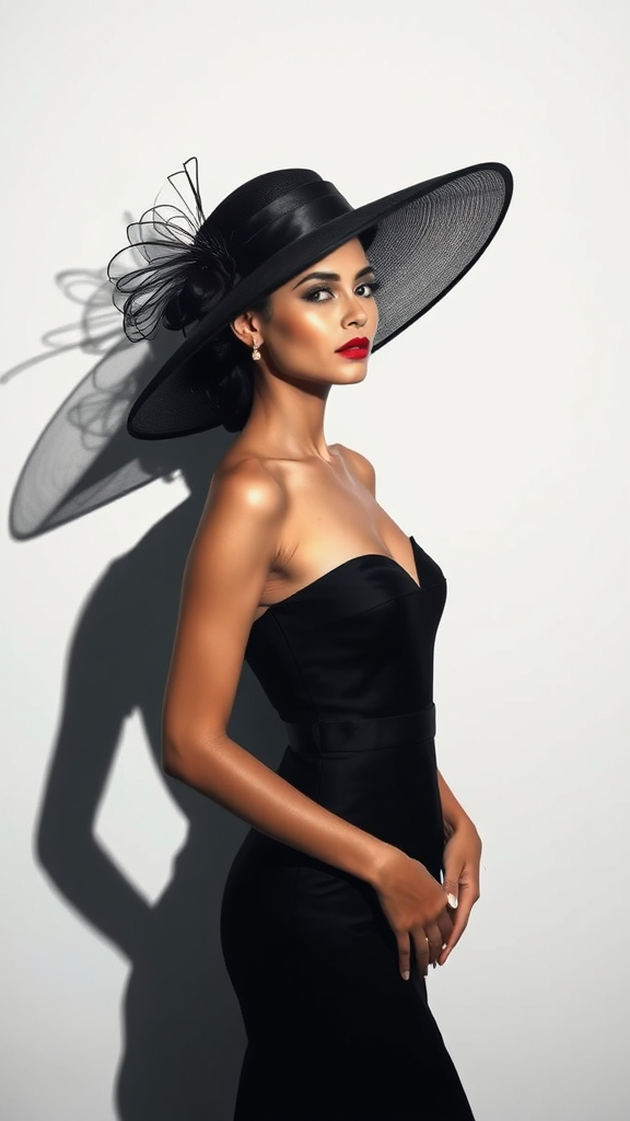 A captivating woman in an elegant black dress gracefully stands, adorned with an oversized hat tilted to the right, elegantly interplaying with negative space. The scene strikes a perfect balance between light and shadow, boasting crisp lines and intricate details. The hat's shadow creates an artful silhouette, highlighting the woman's refined features and adding depth to the image. The contrast between darkness and light evokes a sense of mystery and allure, making the composition breathtakingly beautiful.