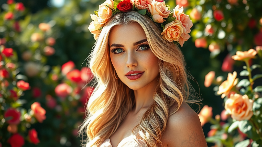 A captivating woman stands gracefully in a vibrant garden, her striking blue eyes sparkling under the sunny sky. Her blonde hair cascades in gentle waves, perfectly complementing the exquisite floral headdress adorning her head. Clad in alluring yet tasteful attire, she embodies an enchanting allure amidst the lush greenery and blooming flowers. The scene is richly detailed, with sunlight casting warm, realistic textures across her skin and surroundings, enhancing the serene and seductive ambiance of this idyllic outdoor setting.