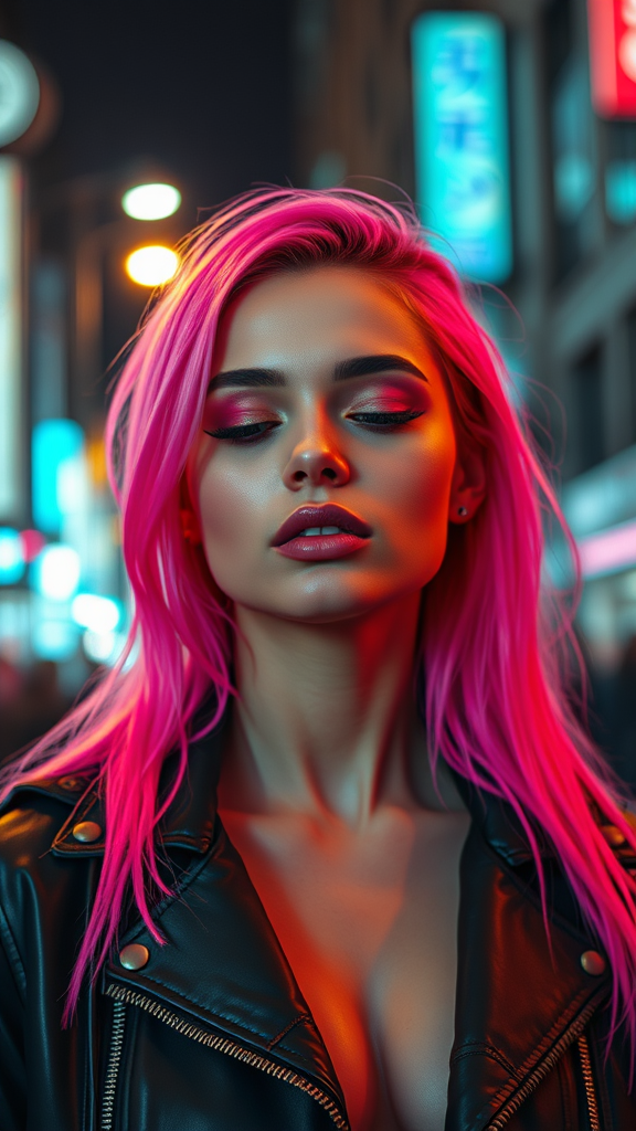 A captivating woman with a charming face and mesmerizing sleepy eyes, dressed in a sleek black jacket, her vibrant neon pink hair shimmering under streetlights, set against a cyberpunk urban backdrop, the photorealistic scene captured in stunning 8k resolution, offering a dramatic vertical composition with a 9:16 aspect ratio, exuding an aura of futuristic allure and urban mystique.