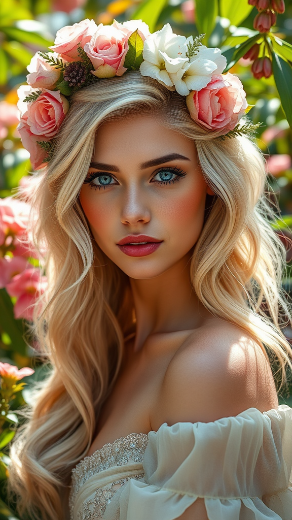 A captivating woman with a floral headdress adorns her cascading blonde hair, her piercing blue eyes glimmering with allure. Dressed in an enchanting outfit that enhances her graceful presence, she stands amidst a vibrant garden. Sunlight filters through the lush foliage, casting a warm, golden glow on her skin, while the realistic textures of her attire and the surrounding blooms create a scene of irresistible charm.