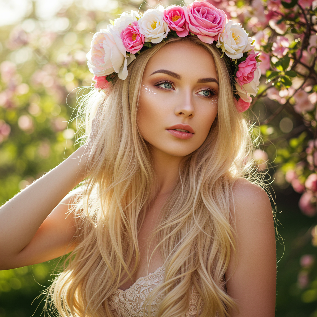 A captivating woman with a floral headdress, her long, blonde hair cascading in waves. Her mesmerizing blue eyes catch the sunlight as she stands adorned in alluring attire, surrounded by a blooming garden. The sunny day highlights the vibrant colors and realistic textures of the scene, with delicate petals and lush greenery encircling her enchanting presence.