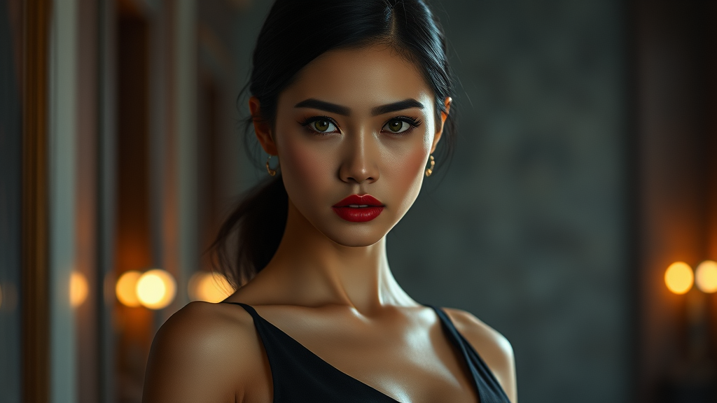 A captivating woman with alluring Asian features, characterized by her strikingly big green eyes and full, shapely lips. A subtle scar adorns her chin, adding an intriguing element to her appearance. She exudes elegance in a sleek, form-fitting black dress that accentuates her silhouette. The scene is set with a cinematic flair, capturing her enigmatic presence and timeless beauty.