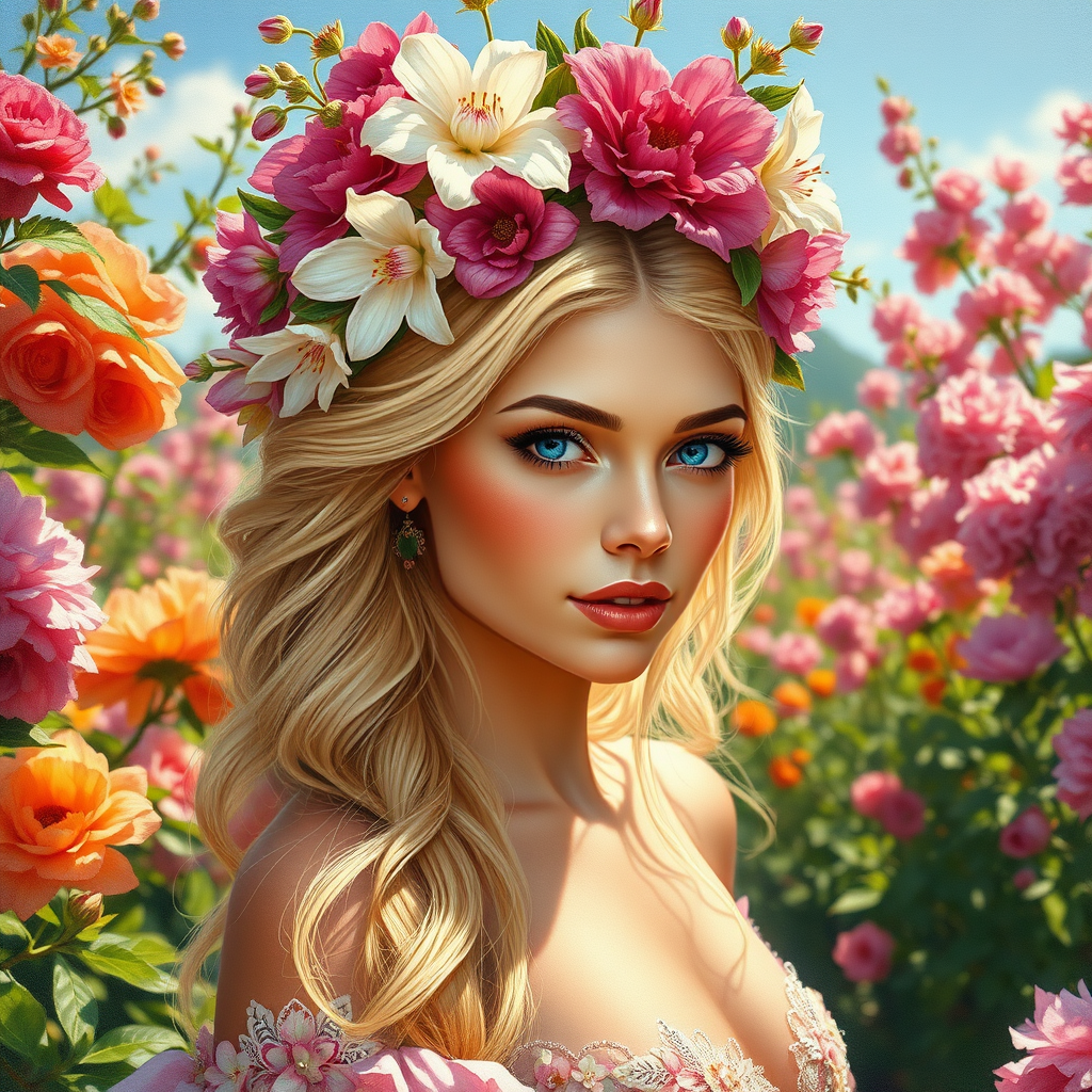 A captivating woman with blonde hair and striking blue eyes stands amidst a lavish garden on a bright, sunny day. She is adorned with a floral headdress, where vibrant blossoms entwine with her flowing locks. Her attire is alluring, with intricate details that complement the natural beauty around her. The scene is painted with realistic textures, capturing the warmth of the sun and the vivid colors of the blossoms, creating an enchanting and harmonious tableau of elegance and allure.