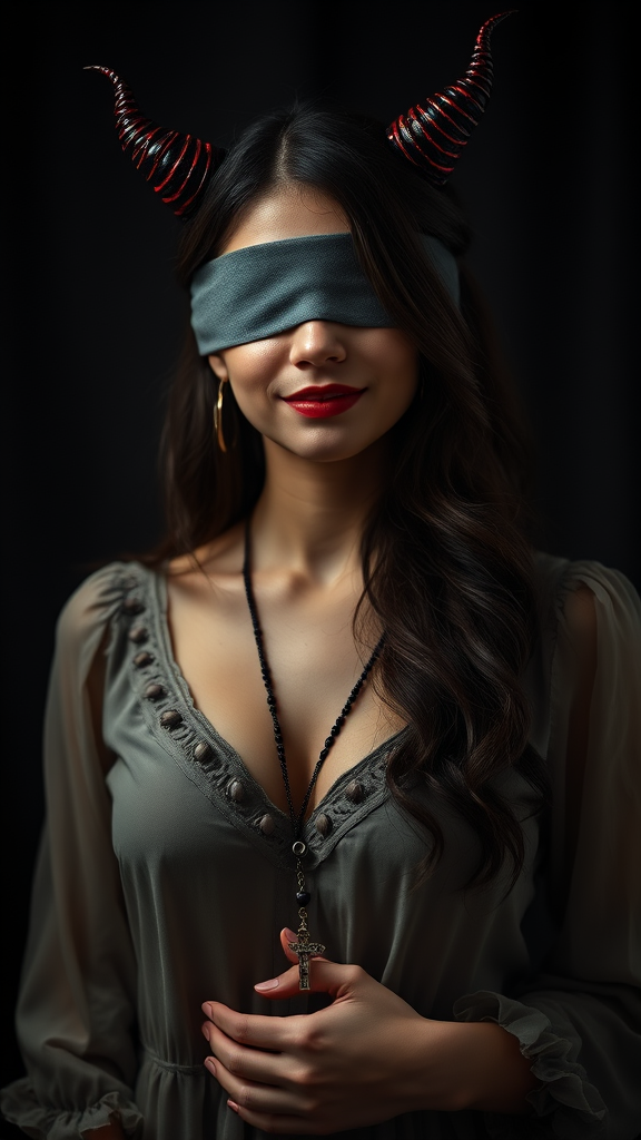 A captivating woman with cute demon horns stands elegantly. Her eyes are gently blindfolded, accentuating her playful, mysterious smile. With her small breasts subtly outlined beneath a delicate blouse, she holds a rosary close to her heart. The composition focuses on her upper body, showcasing her graceful presence. A dark theme envelops the scene, with enhanced clarity and vivid detail in Ultra High Definition 8K. The atmosphere is enchanting and surreal, avoiding imperfections like duplication, disfigurement, or distorted features, ensuring a harmonious portrayal devoid of digital flaws, watermarks, or distracting elements.