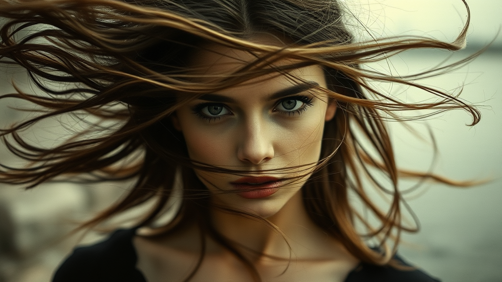 A captivating woman with flowing, untamed hair caught in a gusty breeze, evoking an air of haunting elegance. Her intense gaze holds a mesmerizing allure, set against the backdrop of frozen movement. The scene, reminiscent of toy camera effects, features the grainy texture and high contrast akin to the enigmatic aura of black paintings. Inspired by the New York School, this image captures the subtle intimacy and raw emotion, as if observed through the lens of a classic Voigtlander Bessa R2M.