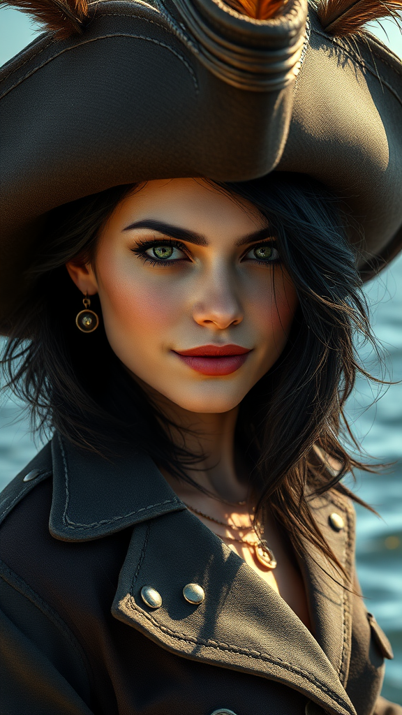 A captivating woman with intense eyes stands confidently by the water, donned in an intricately detailed hat adorned with feathers and a rugged yet elegant jacket. Her features are sharp and graceful, capturing a blend of strength and mystery. The ocean breeze tousles her dark hair, which cascades beneath her hat, adding to her enigmatic aura. Her expression is one of quiet determination, with a hint of a smirk playing at the corners of her lips. The sunlight casts gentle highlights on her skin, creating a vivid contrast against the shadows of her attire. This character portrait is imbued with a sense of adventure and timeless allure, reminiscent of a swashbuckling pirate, blending Charlie Bowater's art style with a masterful painterly approach, inspired by epic portraits found on CGSociety.