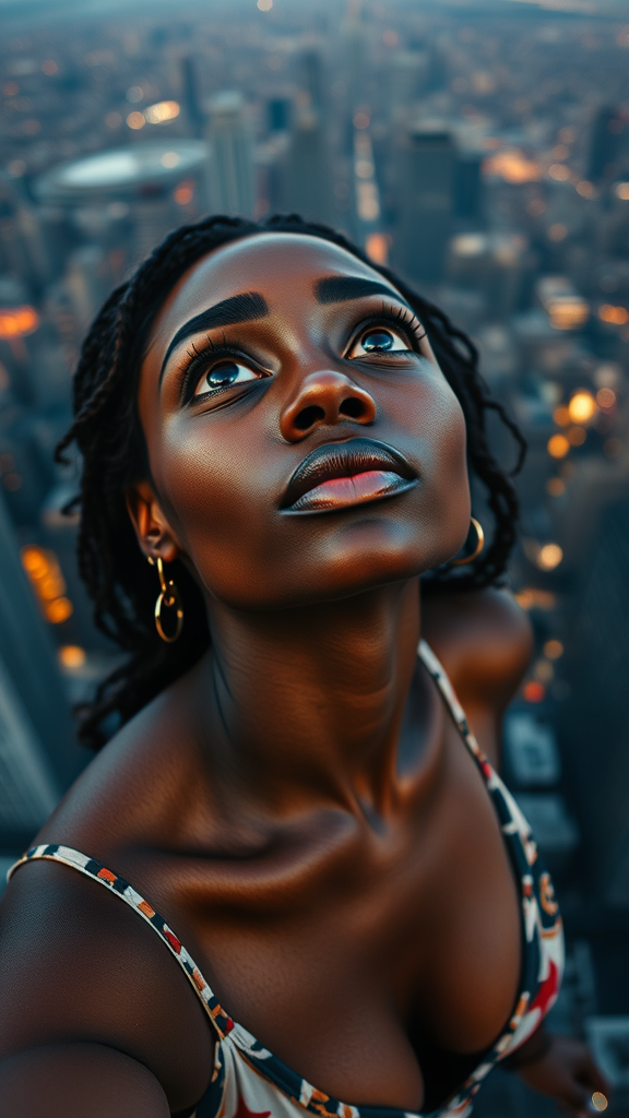 A captivating woman with rich dark skin and strikingly detailed features gazes upward, her entire being portrayed in a high-angle, hyperrealistic shot. Her intricate expression is highlighted by her large, expressive brown eyes, surrounded by carefully-rendered features on a flawlessly textured face. She stands in a dynamic, complex pose, her body artfully composed, with attention to detail in every nuance. The city skyline forms a vivid backdrop, captured with vibrant, rich colors through a Nikon d850 camera paired with a Kodak Portra 400 lens set at f1.6. This masterpiece merges the allure of high-quality photography with an immersive sense of hyperrealism.