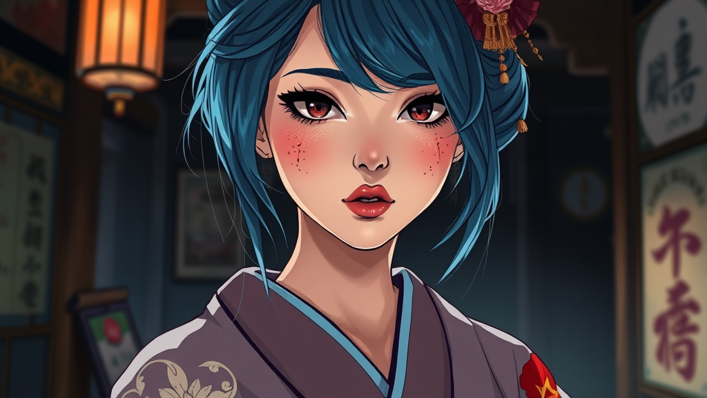 A captivating woman with striking blue hair, adorned in an elegant kimono and traditional geisha makeup, her dark eyes reflecting mystery and allure. Set within an atmospheric Japanese setting, the dimly lit environment enhances her ethereal presence. Her face, subtly glistening with a touch of mud, adds a raw, earthy element to her exquisite beauty. The scene is depicted in a wide view, showcasing an artistic blend of cartoon and realism that heightens the enchanting ambiance of the oriental backdrop.