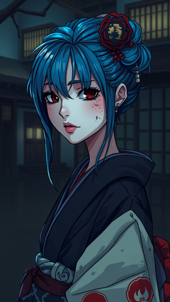 A captivating woman with striking blue hair adorned in a traditional kimono, her face meticulously painted in delicate geisha makeup with alluring dark eyes, stands in a mystical Japanese setting. The dim environment is enhanced by a subtle play of shadows, as the dampness on her skin glistens with traces of mud. The scene captures a wide panoramic view, enveloped in a stylized cartoon aesthetic that adds a touch of whimsy and charm to the enigmatic ambiance.