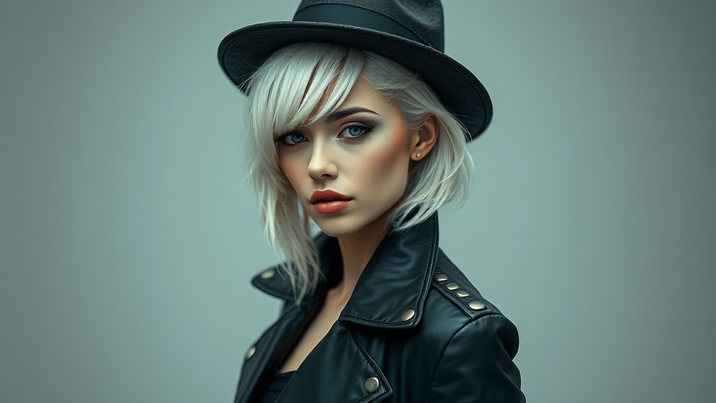 A captivating woman with striking white hair dons a sleek black jacket paired with an intriguing hat, blending an eclectic mix of styles. Her appearance is enveloped in a palette of light gray and subtle bronze, creating an edgy yet ethereal effect. The image employs a soft-focus technique with a blend of dark white and deep cyan tones, complemented by soft edges. The overall look is mesmerizing and eye-catching, exuding an aura of both mystery and elegance.