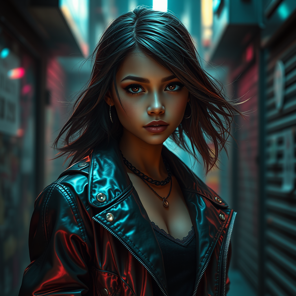 A captivating young cyborg girl inspired by the Deus Ex Mankind Divided style, standing in a dimly lit slum alley. Her pastel-lit surroundings highlight a mysterious smile and bright, piercing eyes. She's wearing a fashion-forward blown jacket, posing like a model in a high-end magazine. Her natural, glossy hair flows freely, contrasted by the gritty urban ambiance of a night city backdrop. The scene captures her allure and charm as she confidently navigates her gritty environment, emphasizing her metallic elements amidst the soft pastel glow. Her outfit, though stylish, shows hints of wear and tear, complementing the industrial vibe of her setting. Despite the flaws in her garment, she remains mesmerizing and impeccably detailed, reflecting a blend of futuristic elegance and raw urban texture.