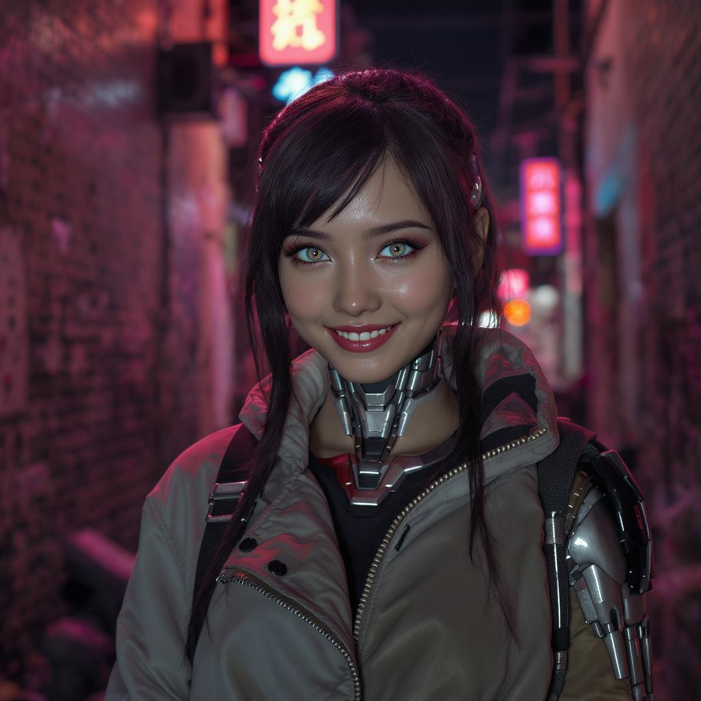 A captivating young cyborg girl with a mysterious smile, her bright and piercing eyes emanating a certain allure, reminiscent of the Deus Ex: Mankind Divided style. She wears a stylish blown jacket akin to those seen in fashion magazines, her attire fitting seamlessly within the vibrant yet gritty atmosphere of a night city slum alley. Her hair, naturally glossy and beautifully maintained, frames her face with an effortlessly elegant look. The scene's pastel lighting casts a soft glow around her, highlighting her features and the intricate design of her cybernetic enhancements. Photographed with a 150mm lens and ISO 100 settings, the image is sharp and clear, free from imperfections like jpeg artifacts or poor anatomy, ensuring a flawless representation that blends futuristic elements with urban edge.
