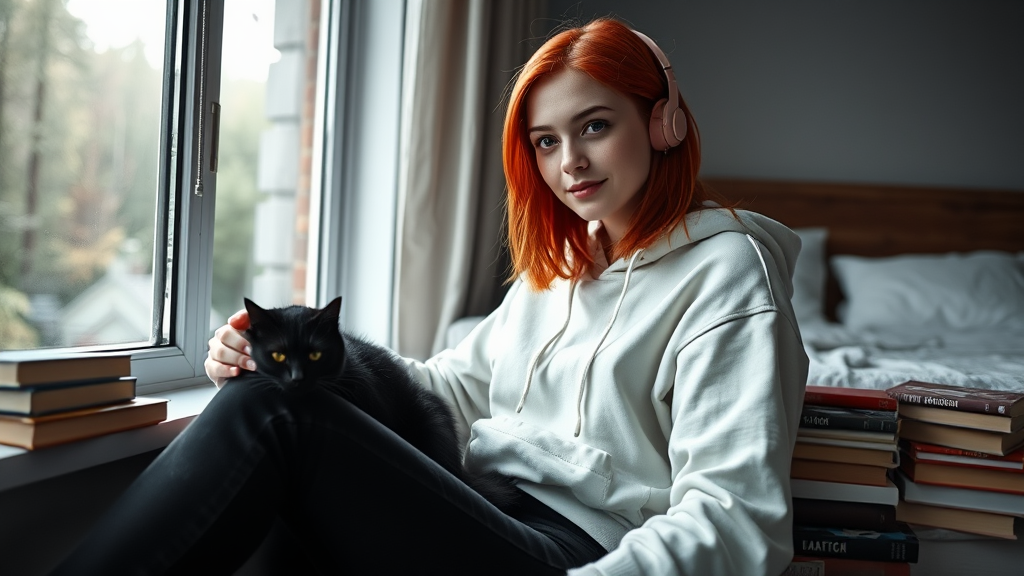 A captivating young Swiss girl sits by a window with headphones nestled among a collection of books. She wears a cozy white hoodie and sleek black jeans. Her enchanting face features neon eyes, vibrant red hair of medium length, a smooth nose, and delicate thin lips. She lounges comfortably, gazing out the window before turning to look into the camera. A black cat rests contentedly on her lap. Behind her is a bed partially obscured by books. The window is open to reveal a serene forest view. The scene is set in muted tones, capturing a sense of tranquility and solitude. This professional 8k photograph utilizes soft natural lighting to create an intimate portrait with an 85 mm lens. It achieves a magical and dramatic atmosphere, emphasizing photorealism and intricate detail. The composition is uninterrupted and clear, devoid of distractions, with a focus on depicting a realistic and engaging portrait.