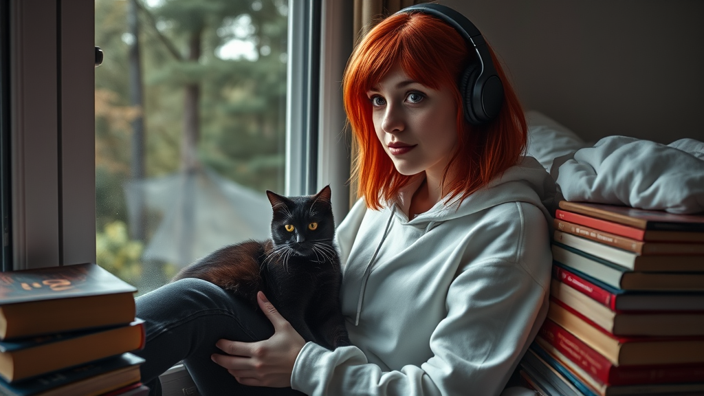 A captivating young Swiss girl with enchanting red hair and neon eyes sits by the window, wearing a white hoodie and black jeans. Her face is beautifully framed by medium-length hair, complemented by a smooth nose and thin lips. She listens to music through her headphones, surrounded by an array of books. A black cat rests on her lap as she gazes out the window towards the serene forest outside. The soft natural lighting casts a magical, intimate atmosphere, with muted tones adding depth to the scene. A bed behind the books completes the cozy setup. The image evokes a sense of mystery and wonder, captured in exquisite detail through an 85 mm lens, emphasizing photorealism and dramatic lighting in an over-detailed, cinematic portrait.
