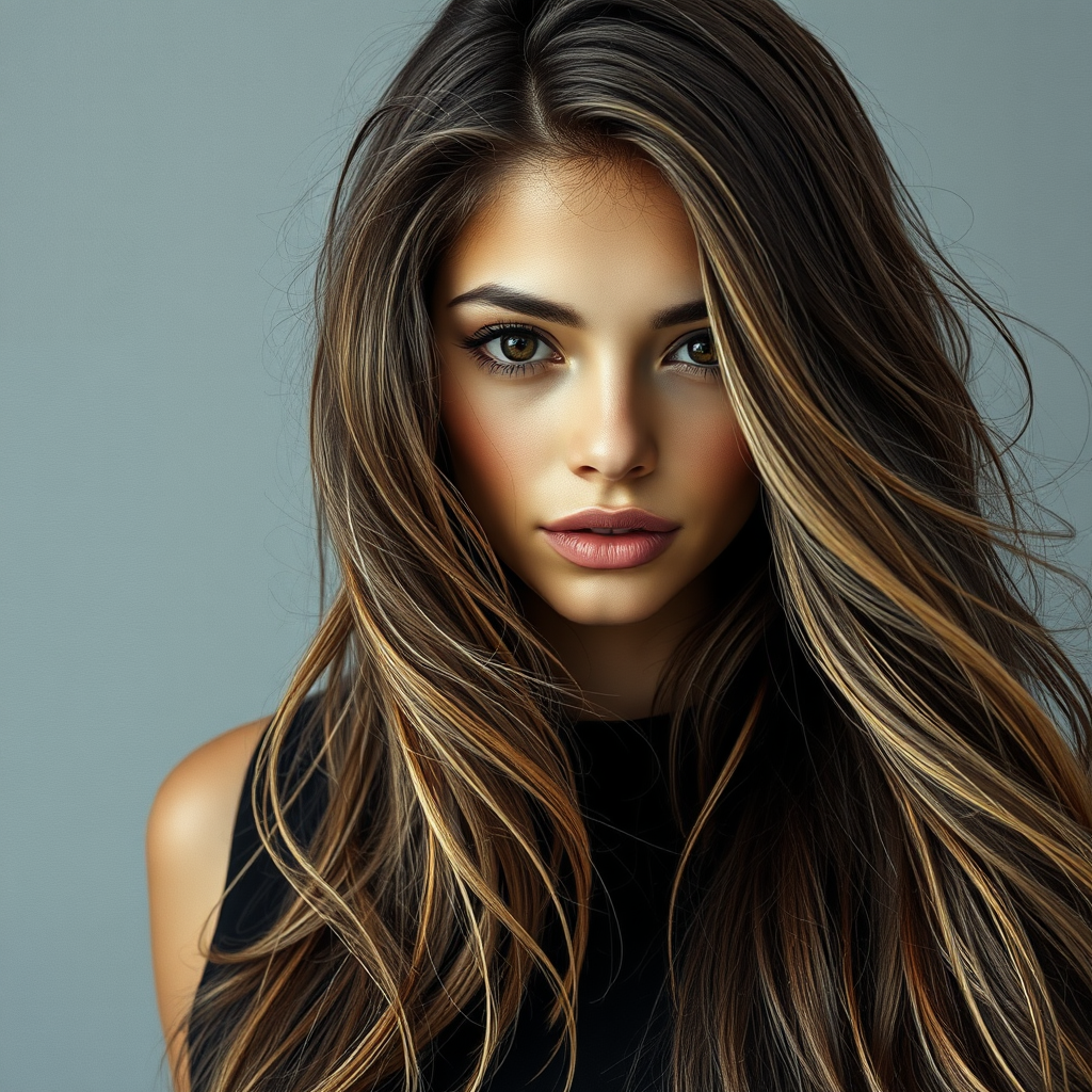 A captivating young woman with long, flowing hair dressed in shades of black, envisioned in the style of intricate textural layers resembling reef waves. Her light brown and dark black tones blend seamlessly in a wet-on-wet fashion, creating a mesmerizing wavy texture. Her gaze holds an entrancing allure, with a pop art influence subtly weaving throughout the composition, enhancing the overall charm and magnetism.