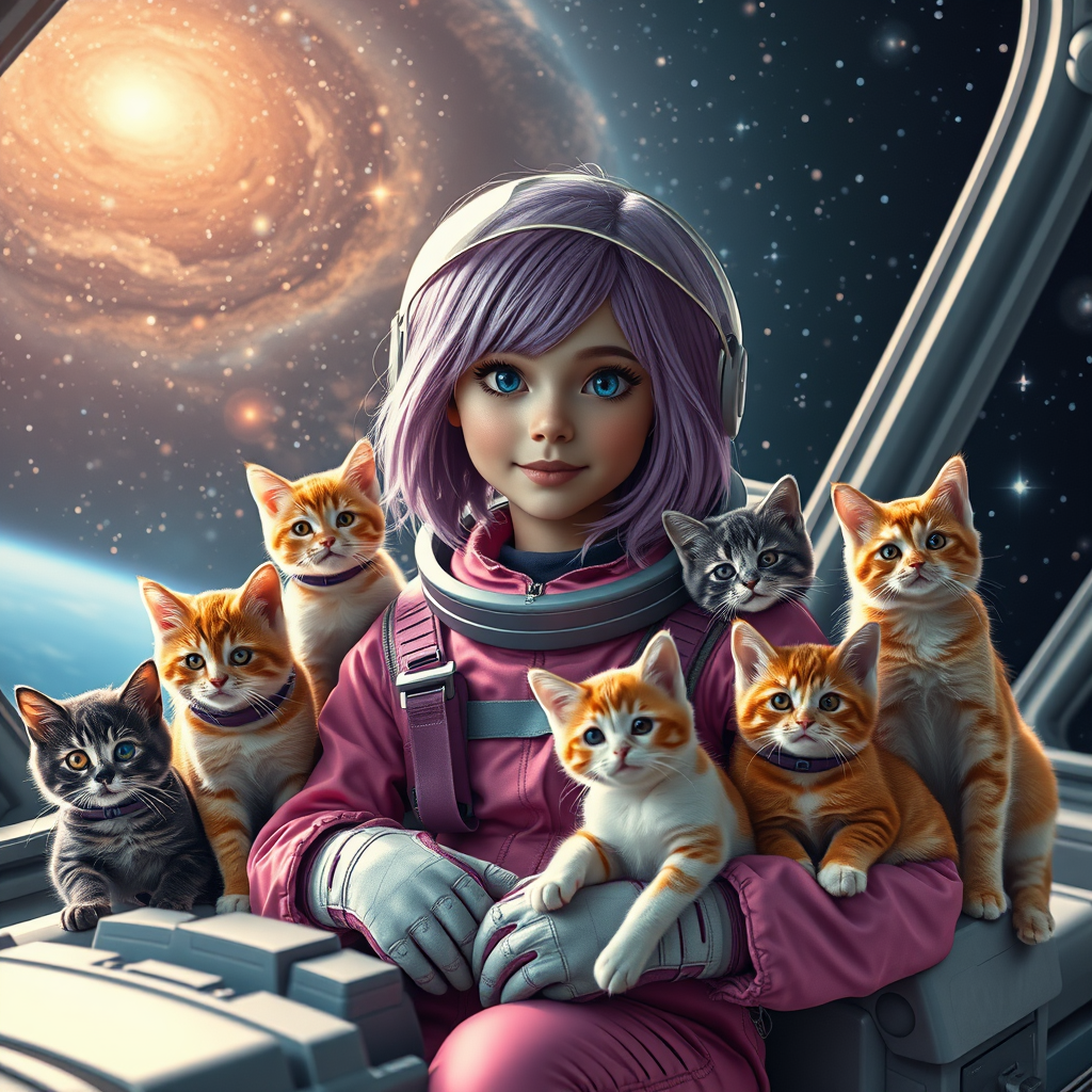 A captivating young woman with vibrant lavender hair is surrounded by an assortment of cats, each uniquely hued and sized, on a sophisticated space station. She is dressed in an adorably stylish pink and purple spacesuit, while the cats are clad in their own miniature astronaut outfits. The backdrop reveals the boundless expanse of space, dotted with luminous stars and swirling galaxies. The space station is sleek and modern, accented with intricate mechanical elements. This enchanting, futuristic scene showcases the girl and her feline companions embarking on a cosmic adventure together, captured in stunning 8k resolution with lifelike and radiant details. The image boasts cinematic lighting, reminiscent of the rich tones of 35mm f1.4 Fuji color film, adding depth and warmth to their whimsical exploration.