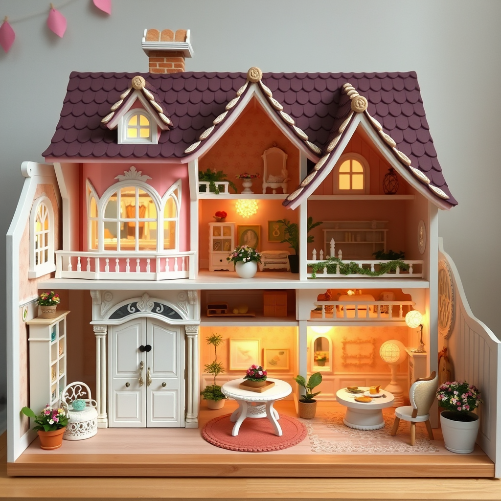 A captivatingly exquisite dollhouse, infused with a delightful kawaii ambiance, exuding a blissful mood throughout its intricately detailed rooms.