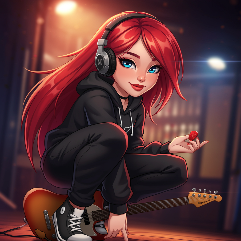 A cartoon anime-style illustration featuring a red-haired Asian girl with long hair styled to one side, striking a flirtatious pose with a smile. She has blue eyes and red lips, wearing black pants and a hoodie. The scene is captured in hyper-detail with intricate features, showcasing dramatic lighting and high contrast. She's wearing headphones and holding a plectrum while playing a guitar. The shot is dynamic, capturing her from a cowboy shot angle. The atmosphere is lively and slightly blurry, giving a sense of movement and energy to the composition.