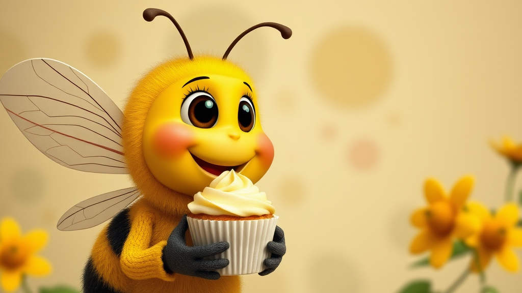 A cartoon bee in a vibrant yellow outfit holds a cupcake, its whimsical charm reminiscent of Ilya Kuvshinov's warm character illustrations. Infused with Seth MacFarlane's playful flair, the scene captures the meticulous attention to detail found in photorealistic still lifes. Echoes of David Teniers the Younger's artistry lend an old-world charm, while modern touches like screen tones add texture and depth. The ultra-high-definition setting enhances the bee's cheerful expression, rendered with a soft stylization. The scene, framed in an aspect ratio of 71:128, radiates a blend of nostalgia and contemporary style, inviting a smile with its delightful and endearing composition.