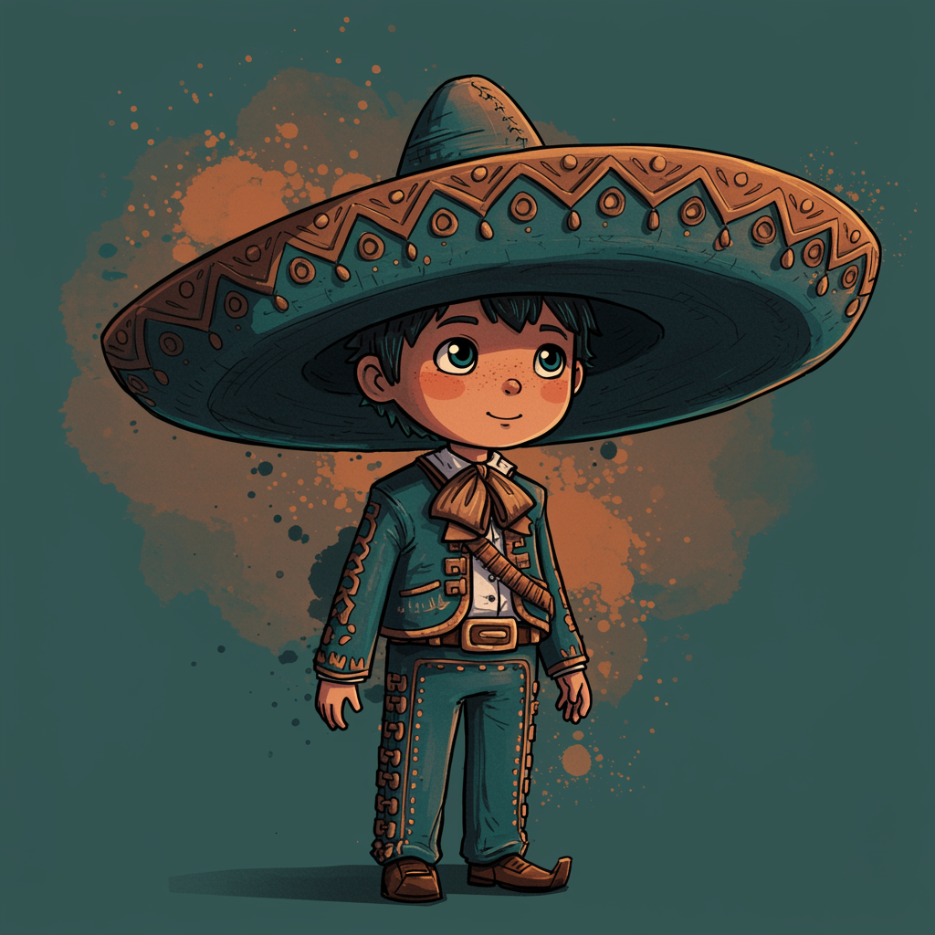 A cartoon boy adorned in an oversized sombrero, depicted in the style of detailed comic book art, featuring hues of dark cyan and bronze with artistic stains and washes. The boy exudes child-like innocence, his face lit up with curiosity, against a backdrop of soft shadows. His costume is intricately detailed, combining traditional elements with playful, imaginative patterns. The artwork embraces an appropriation art style, blending cultural motifs with a whimsical, modern twist, while capturing the wonder and joy of youth.