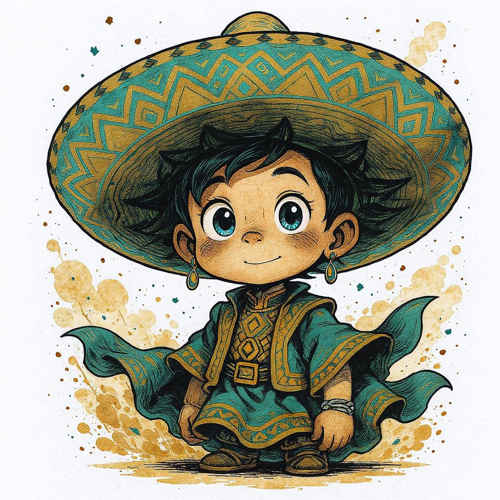 A cartoon boy dons a large sombrero with intricate patterns, drawn in the style of detailed comic book art. The color palette features deep cyan and rich bronze, with textured stains and washes adding depth. The boy’s expression exudes child-like innocence, his eyes wide and curious. His costume, a fusion of traditional and imaginative elements, is meticulously detailed, with flowing fabrics and playful accessories. The art style blends a sense of appropriation with an innovative twist, capturing a youthful essence. The background is dynamic, reflecting an rtx-inspired vibrancy with an air of whimsical adventure.