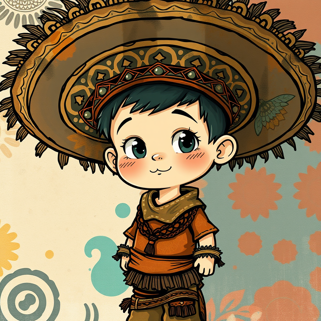 A cartoon boy wearing a large sombrero, illustrated in the style of detailed comic book art, featuring a color palette of dark cyan and bronze. The scene includes stains and washes, highlighting the texture and depth. The boy exudes child-like innocence, dressed in a richly detailed costume that reflects elements of an appropriation artist. His attire and posture convey a sense of playful curiosity and wonder. The background features a mix of soft and bold patterns, enhancing the focal point of the drawing with an innovative blend of cultural and artistic elements.