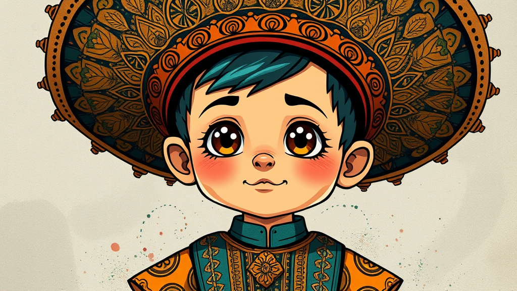 A cartoon boy with a large, ornate sombrero crafted with intricate patterns in a vibrant mix of dark cyan and bronze hues stands boldly, his expression radiating child-like innocence. His eyes glisten with curiosity, bringing life to his animated features. The detailed comic book art captures the exquisite textures of his costume, adorned with symbols and designs hinting at cultural narratives. His outfit is playfully splattered with artistic stains and washes, adding depth and character to the illustration. This scene blends whimsical charm with a thoughtful homage to heritage, merging traditional aesthetics with a modern, imaginative flair in a style akin to a master appropriation artist.