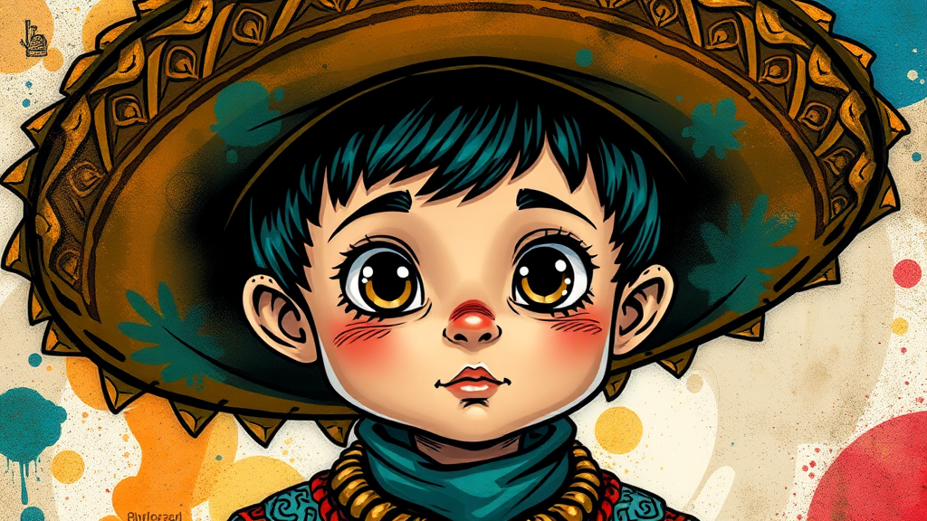 A cartoon boy with child-like innocence, adorned in a sombrero, depicted in detailed comic book art style, blending dark cyan and bronze hues with stains and washes. His costume is intricate, showcasing vibrant patterns and textures, reflecting a playful homage to cultural attire. The boy's wide, curious eyes convey a sense of wonder and adventure. The background is an abstract mix of swirling colors and shapes, enhancing the artistic depiction.
