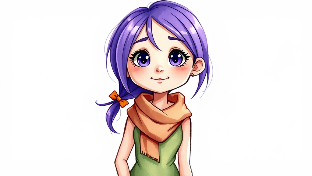 A cartoon character with vibrant purple hair and a stylish scarf around her neck. She stands confidently against a clean white background, painted with a watercolors technique. The character has a lively expression, showcasing unique features with a touch of artistic flair. The scene is subtly backlit, adding depth and softness to her appearance. Her skin has a natural texture, highlighting individuality through gentle blemishes. Her playful pose and lively demeanor exude charm, despite the abstract and whimsical sketch-like quality of the artwork. The picture complements her distinct persona, capturing the essence of creativity and imagination.