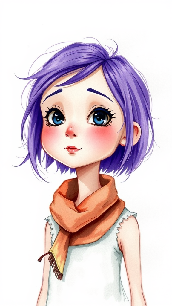 A cartoon character with vibrant purple hair and a playful scarf around her neck, set against a clean white background. The artwork is reminiscent of watercolors, showcasing a blend of paintings and sketches. The character's youthful skin contrasts with the textured backdrop, highlighted by subtle skin details such as freckles and natural blemishes. The lighting casts a gentle backlighting effect, adding depth and softness to the scene. The character is whimsically distorted, with exaggerated features like elongated limbs and simplified hands, giving a surreal yet charming appearance. The overall impression is one of a dreamlike, artistic abstraction, capturing the essence of childhood imagination with a touch of whimsy, despite blurry and imperfect elements in the execution.