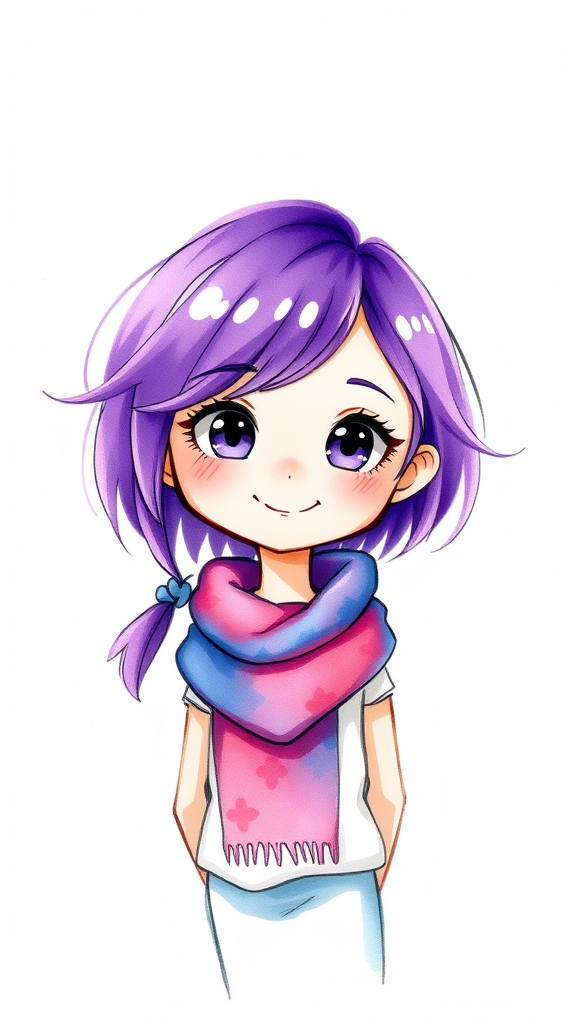 A cartoon character with vibrant purple hair and a stylish scarf around her neck stands against a simple white background. She's portrayed with watercolors to give a soft, artistic feel reminiscent of classic illustrations. Her expression is lively, with clear, bright eyes and a gentle smile, reflecting her whimsical personality. The details are captured in a sketch-like manner, focusing on the character's unique charm while avoiding distractions like skin imperfections or unusual features. She shows a relaxed posture, exuding confidence and creativity, with a natural, youthful appearance. The simplicity of the background highlights her colorful presence and brings attention to the delicate brushwork that captures her vivid hair and expressive face. The overall composition has a slightly textured look, akin to traditional paintings, offering a sense of warmth and individuality.