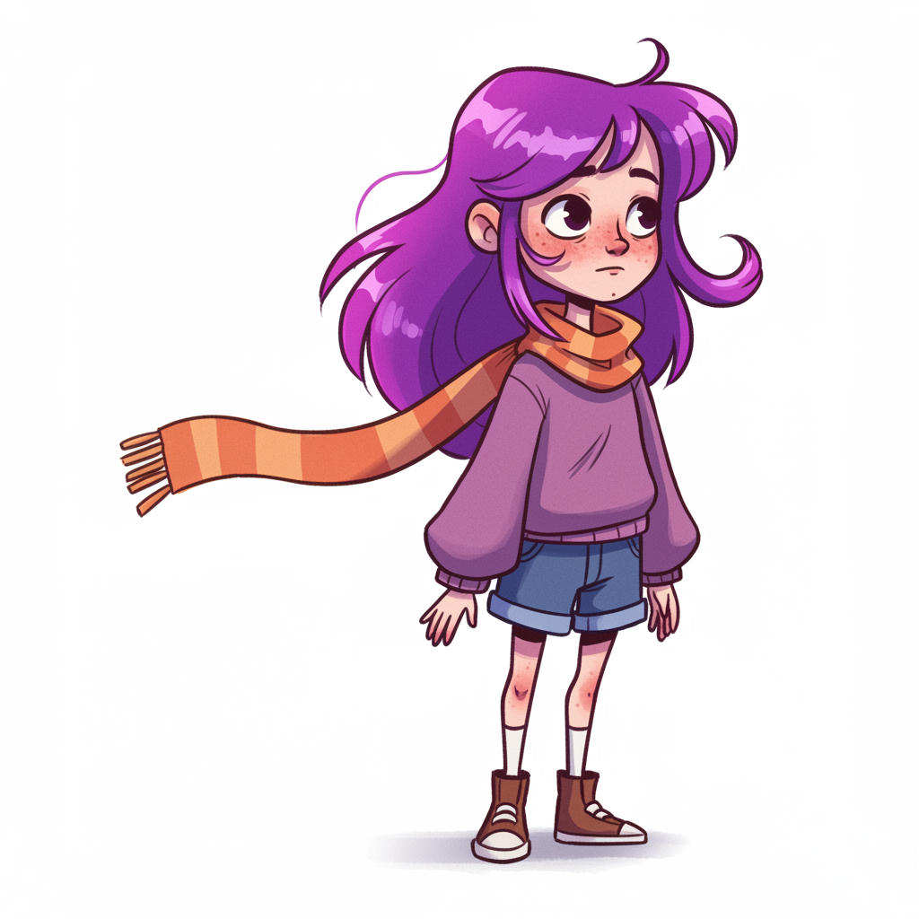 A cartoon character with vibrant purple hair and a stylish scarf around her neck stands confidently against a clean white backdrop. Her whimsical charm shines through in a watercolor style that blends smoothly with a touch of sketch-like detail, adding an artistic flair. She has unique skin characteristics, giving her a relatable and authentic appearance with minor imperfections. The play of light enhances her features, casting gentle shadows and creating a subtle backlight effect. The character's hands and limbs are realistically rendered, avoiding any distortions, and she carries an aura of youthful exuberance. Her playful expression captures curiosity and innocence, bringing a sense of warmth and personality to the scene. A hint of dynamic energy emanates from her stance, inviting viewers into her imaginative world. The overall composition balances creativity and simplicity, allowing the character's vibrant essence to take center stage.