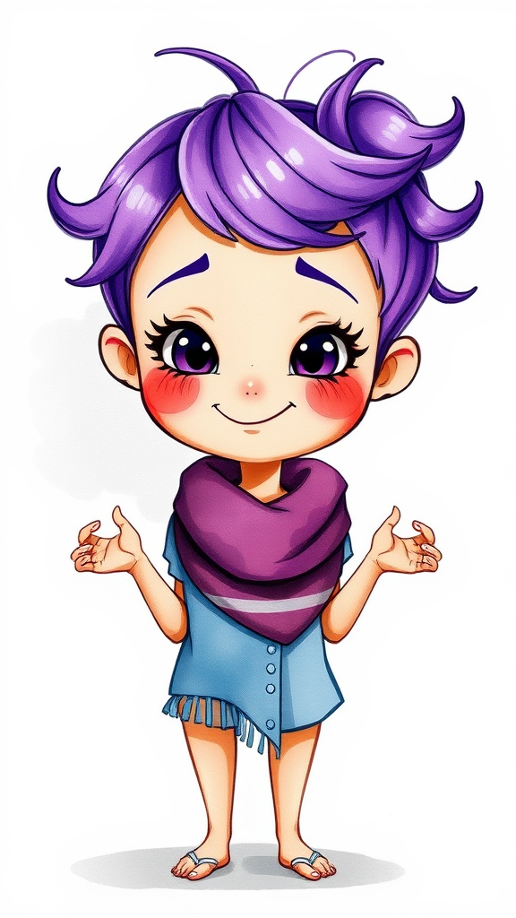 A cartoon character with vibrant purple hair styled playfully, wearing a chic scarf around her neck. She stands against a simple white backdrop, her features captured in a watercolor style that brings an artistic touch reminiscent of sketches and paintings. Her skin has unique texture details, showing natural skin spots and blemishes, adding a touch of realism. She's illuminated gently from behind, emphasizing her silhouette with a soft glow. Her hands are expressive yet imperfect, highlighting her individual charm with visible imperfections. Her design includes whimsical elements like slightly exaggerated limbs, lending her an endearing, quirky appearance without any missing or extra digits. Her lively eyes beam with curiosity, and she possesses a youthful spirit. Despite the low resolution, her joyful essence shines through, surrounded by a subtle shadow that adds depth to the composition.