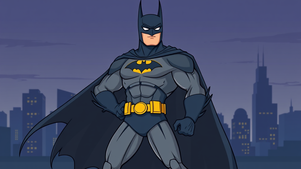 A cartoon comic style illustration of a full body Batman character in an 8K resolution, capturing a dynamic and powerful pose. The artwork features minimal detailing, emphasizing clean lines and bold shapes to highlight his iconic cape and cowl. Batman stands poised, ready for action, with a sense of motion and energy. The background is a subtle Gotham City skyline at dusk, adding depth and atmosphere without overwhelming the central figure. The color palette is dark and moody, with shades of blue and gray contrasting against the vibrant yellow of the Bat symbol on his chest.
