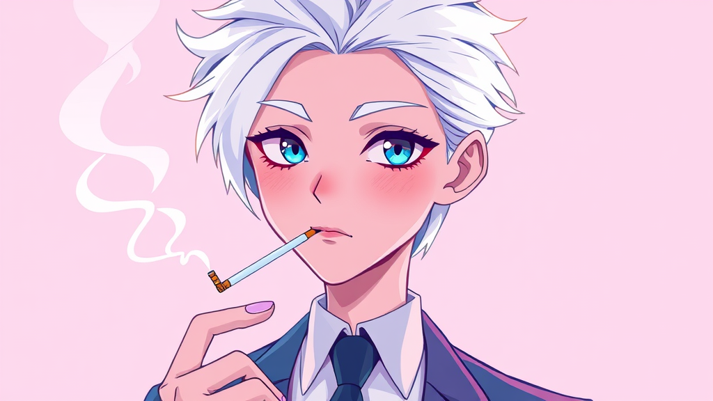 A cartoon-like illustration featuring a person with striking white hair and sharp, gentle eyes, exuding an aura of sophistication. They're dressed in a sleek, stylish suit, holding a slender cigarette with wisps of smoke curling gracefully around them. The artwork employs bright pastel colors, reminiscent of a retro anime aesthetic blended with influences from digital artists like Yanjun Cheng, Beeple, Rhads, and Lois van Baarle. The scene is bathed in soft hues of pink, blue, and lavender, creating a harmonious balance between modern digital artistry and classic anime charm, while subtle creative elements hint at a whimsical yet refined personality.