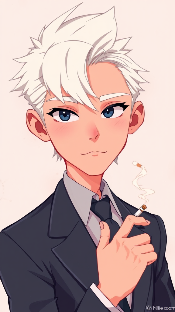 A cartoon-like illustration of a person with striking white hair and sharp, gentle eyes, wearing a sleek suit. Their expression exudes calm sophistication as they elegantly hold a cigarette. The artwork showcases a harmonious blend of bright pastel colors, capturing the essence of retro anime. The style, influenced by digital artists Yanjun Cheng, Beeple, Rhads, and Lois van Baarle, presents a captivating character set against a soft, abstract background, subtly textured to add depth and charm without losing its whimsical appeal.