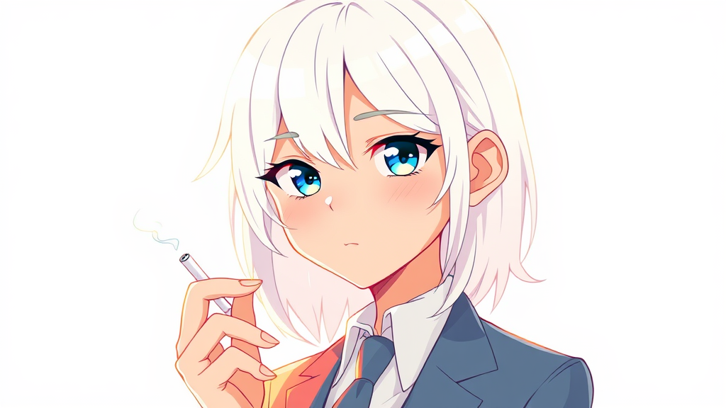A cartoon-like illustration of a person with white hair, softly cascading down their face, while they hold a cigarette in one hand. Their sharp eyes convey a sense of wisdom and kindness. They are dressed in a stylish, tailored suit that complements their gentle demeanor. The artwork is awash with bright pastel colors, creating a dreamy and surreal quality reminiscent of a retro anime aesthetic. The inspiration from digital artists such as Yanjun Cheng, Beeple, Rhads, and Lois van Baarle is evident in the harmonious blend of light and color, bringing a vibrant yet delicate atmosphere to the scene. Small creative elements such as subtle texture details in the suit and a hint of whimsical pastel smoke swirling around them add depth and intrigue, making the character stand out in their own unique way.